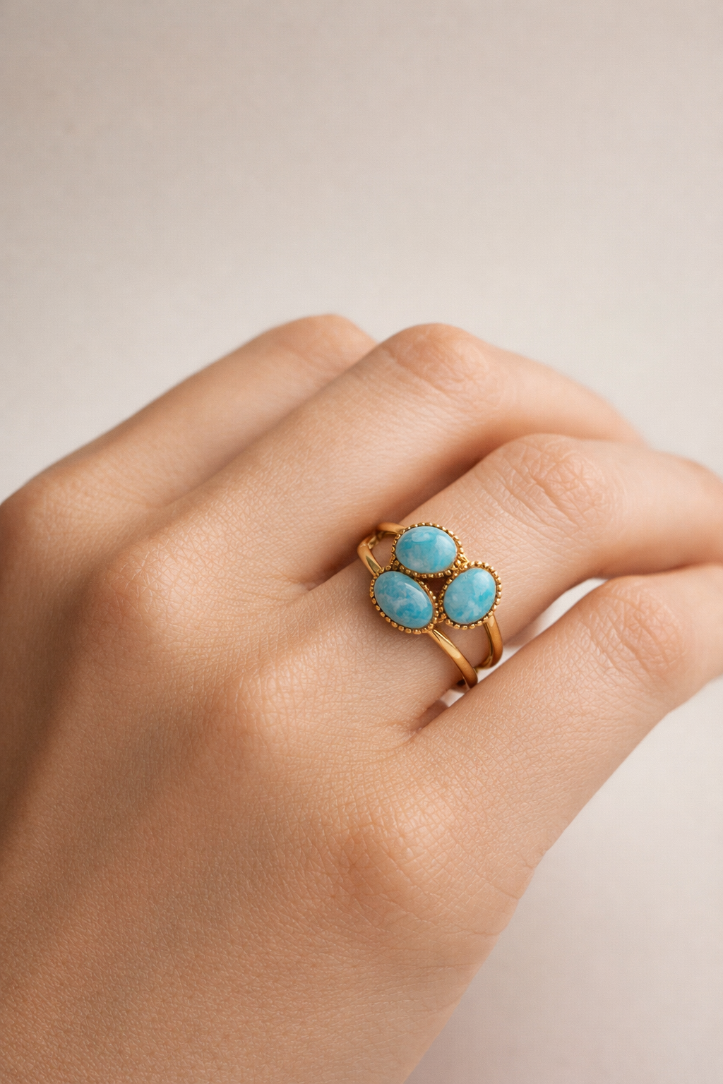 AzureTrio yüzük, dingin mavi-yeşil tonlara sahip üç adet amazonit taşıyla tasarlanmış ferah ve dengeli bir görünüm sunar. Taşların doğal dokusu ve yumuşak renk geçişleri yüzüğe sakin ama dikkat çekici bir karakter kazandırırken, altın tonlu metal gövde tasarımı zarafetle tamamlar. Günlük kullanımda hafif ve doğal bir şıklık arayanlar için ideal bir parçadır.