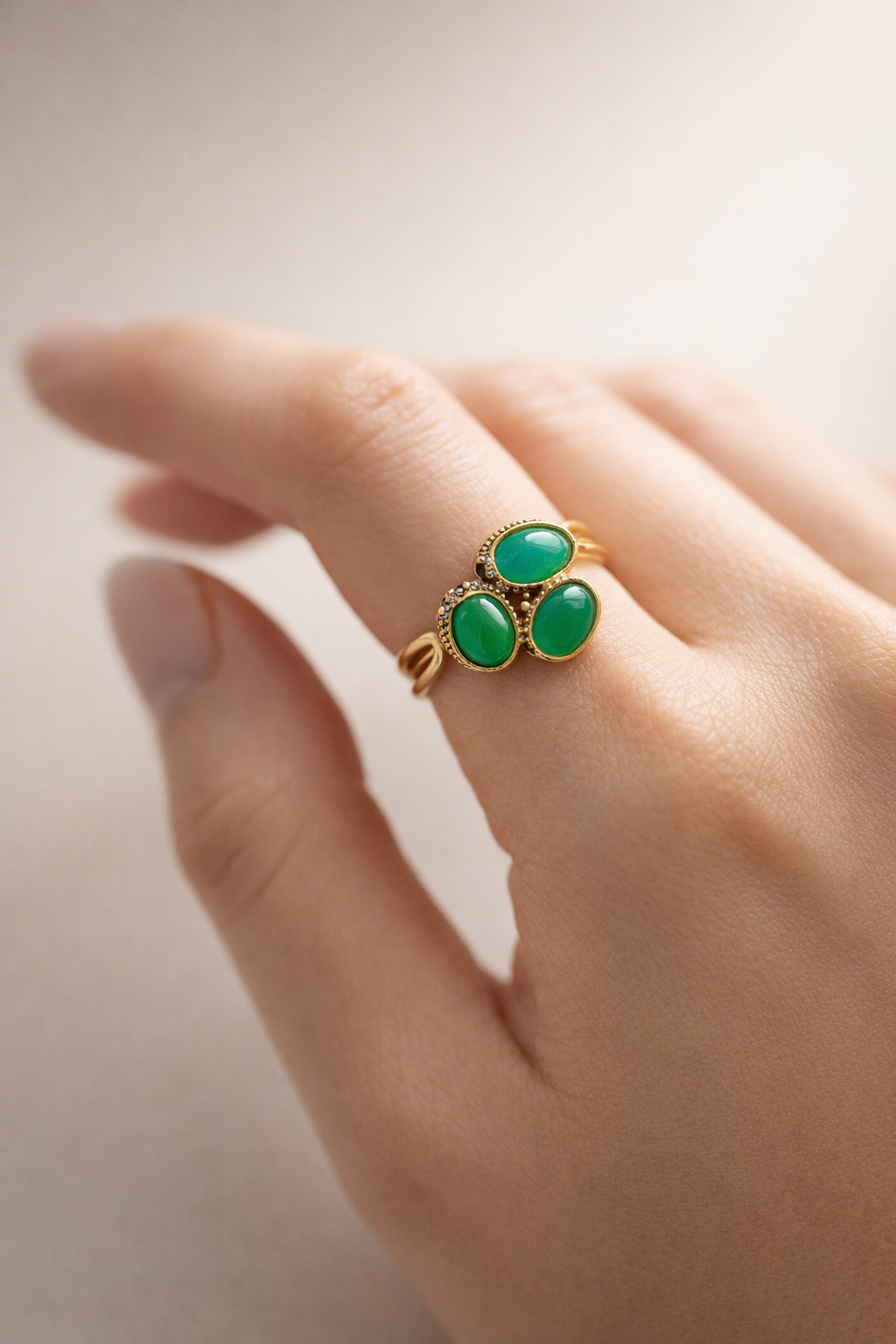 Üçlü taş kompozisyonuyla öne çıkan Emerald Touch yüzük, sade ama etkileyici bir şıklık sunar. Yuvarlak formlu yeşil taşları, altın tonlu metal çerçeveyle dengeli bir görünüm oluştururken, minimal yapısı sayesinde hem günlük kullanımda hem de özel anlarda rahatlıkla tercih edilebilir. Zamansız tasarımıyla tek başına güçlü bir stil ifadesi yaratır.