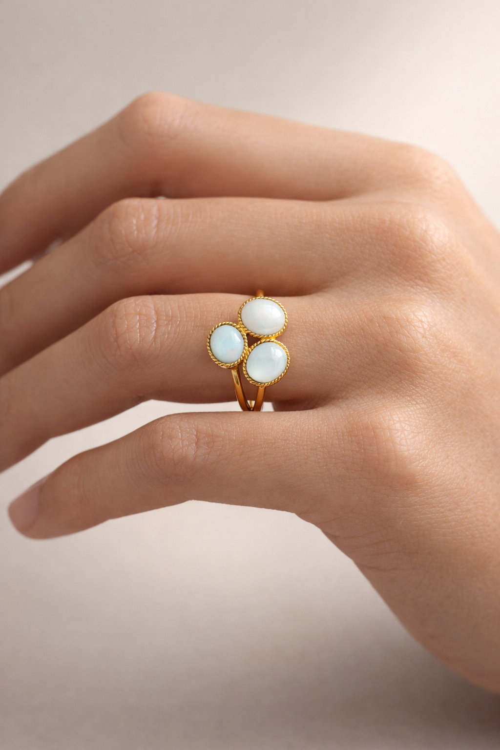 PearlAura yüzük, yumuşak beyaz tonlara sahip üç adet sedef taşıyla sade ve aydınlık bir zarafet sunar. Taşların doğal parlaklığı ışıkla birlikte hafif yansımalar oluşturarak yüzüğe ferah ve sofistike bir görünüm kazandırır. Altın tonlu metal formu, sedef taşların saf duruşunu dengeler ve zamansız bir stil yaratır. Günlük şıklıkta olduğu kadar özel anlarda da rahatlıkla tercih edilebilir.