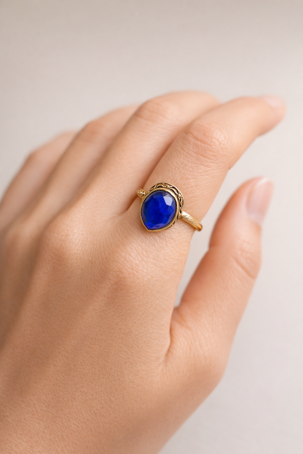 Derin mavi lapis lazuli taşıyla dikkat çeken DeepBlue yüzük, sade formu ve güçlü rengiyle zarif bir duruş sergiler. Oval kesimli taş, altın tonlu metal gövdeyle dengeli bir kontrast oluştururken, yüzüğün yalın tasarımı taşı ön plana çıkarır. Hem gündelik kombinlerde hem de özel anlarda sofistike bir tamamlayıcı olarak kullanılabilir.